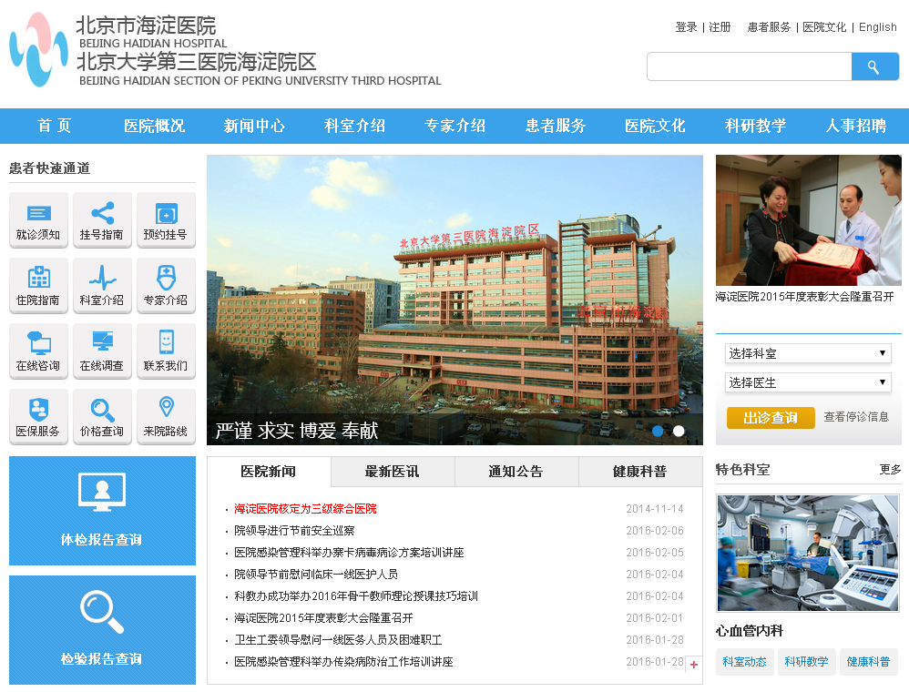 北京市海淀醫(yī)院(北京大學第三醫(yī)院海淀院區(qū))位于海淀區(qū)中關村國家科技自主創(chuàng)新核心區(qū),緊鄰地鐵四號線、十號線,是一所集醫(yī)療、科研、教學、預防保健于一體的大型現代化三級綜合性醫(yī)院,是北京市醫(yī)保定點醫(yī)院,2008年北京奧運會、殘奧會定點醫(yī)院。目前承擔著北京中醫(yī)藥大學、南昌大學研究生培養(yǎng)任務;海淀衛(wèi)校臨床教學及實習任務,現為南昌大學教學醫(yī)院;北京市全科住院醫(yī)師規(guī)范化培訓基地。醫(yī)院不僅擔負著海淀區(qū)300多萬人口的醫(yī)療服務任務,還同時擔負著周邊高等學府、科研院…